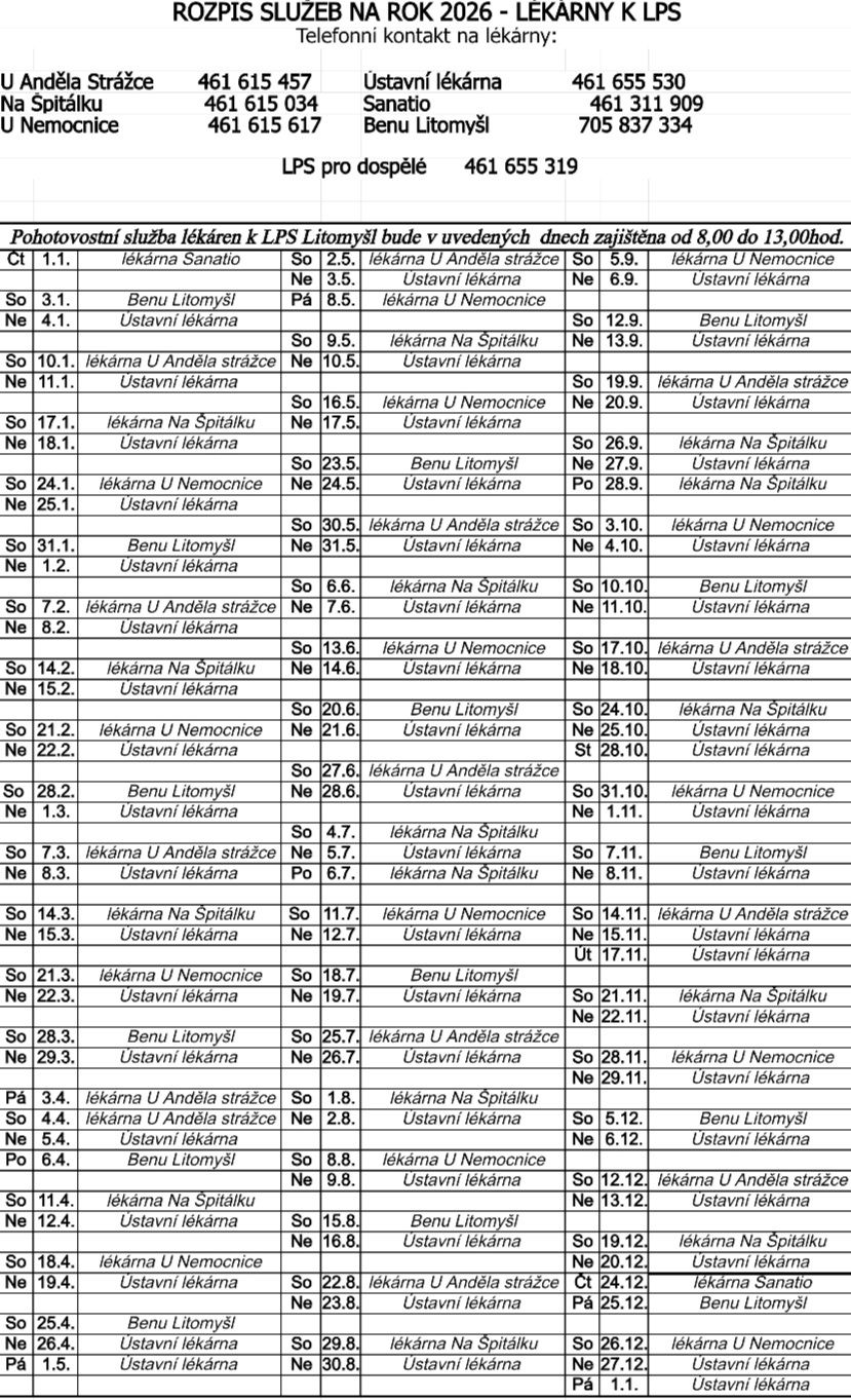 sobota 8:00 - 12:00 (pouze v sudé týdny - střídavě s Lékárnou Na Špitálku )